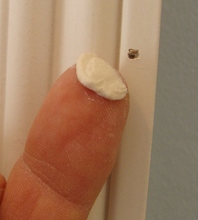 Using your finger, apply and press an appropriate amount of spackle into the thumb tack hole.