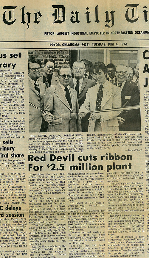 1974 – To be more centrally located to all its customers, Red Devil, Inc. opens a new chemical production facility in Pryor, OK. The company would later relocate all manufacturing operations from Union, NJ to Pryor.