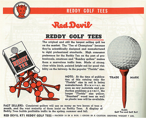 1942 – The patented Reddy Tee is added to the family of Red Devil products. Its singular wooden piece and grooved top design would become the standard for the modern wooden golf tee.